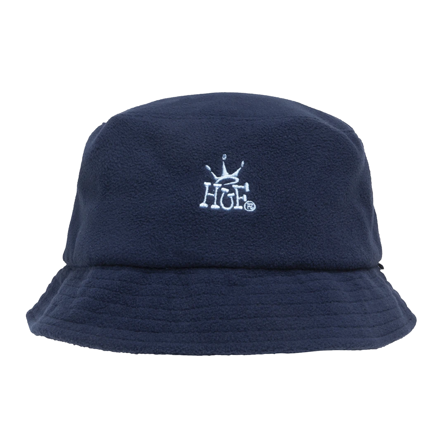 HUF Crown Polar Fleece Bucket Hat. Polar fleece bucket hat. Classic streetwear crown iconography with funky HUF hand lettering. Embroidered HUF 'Crown' artwork at front. HUF woven flag label at side. Embroidered eyelets for ventilation. 100% Polyester. Imported.