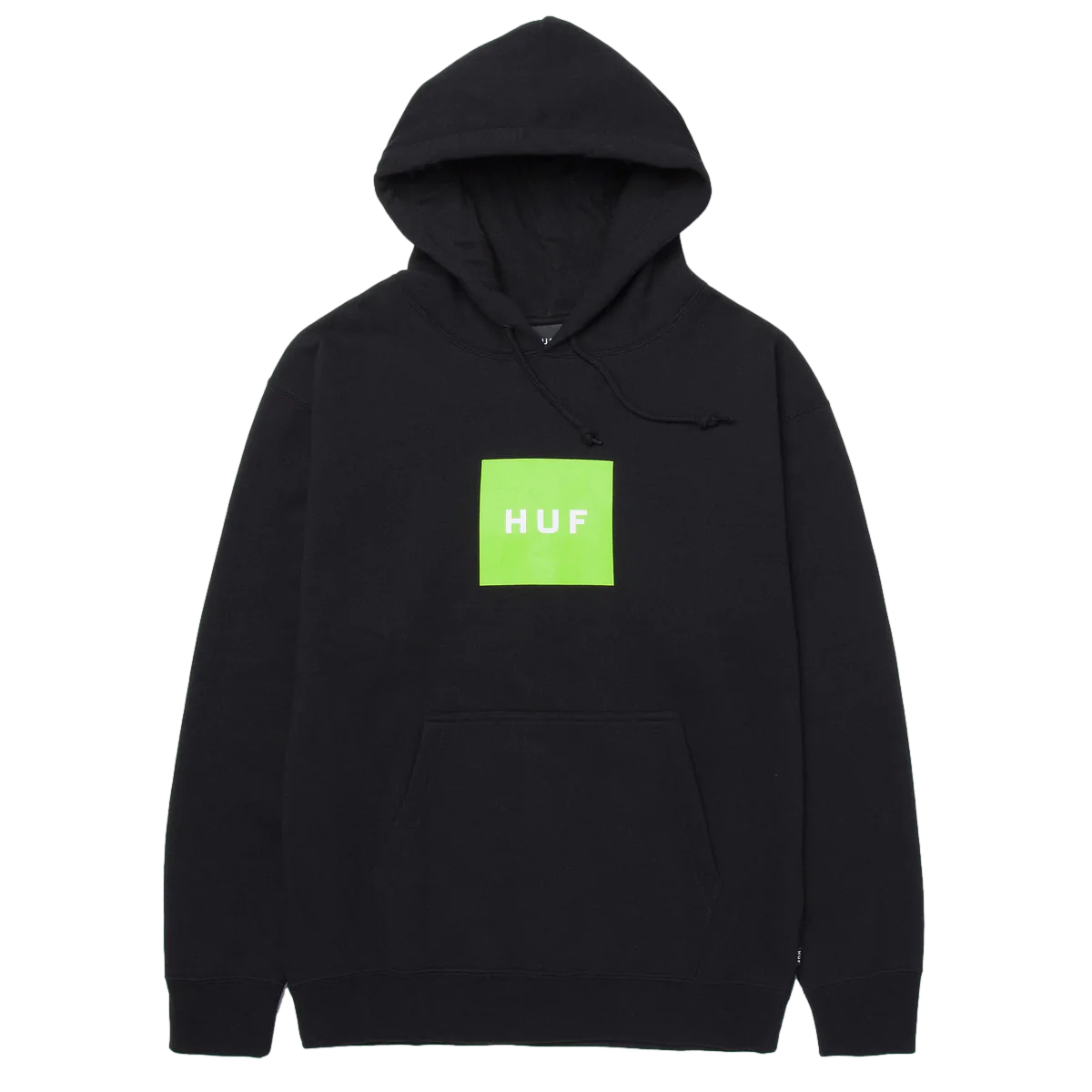 Huf Essentials Box Logo Pullover. The Essential Box Logo Pullover Hoodie is made of super-soft fleece with artwork printed at the center chest.