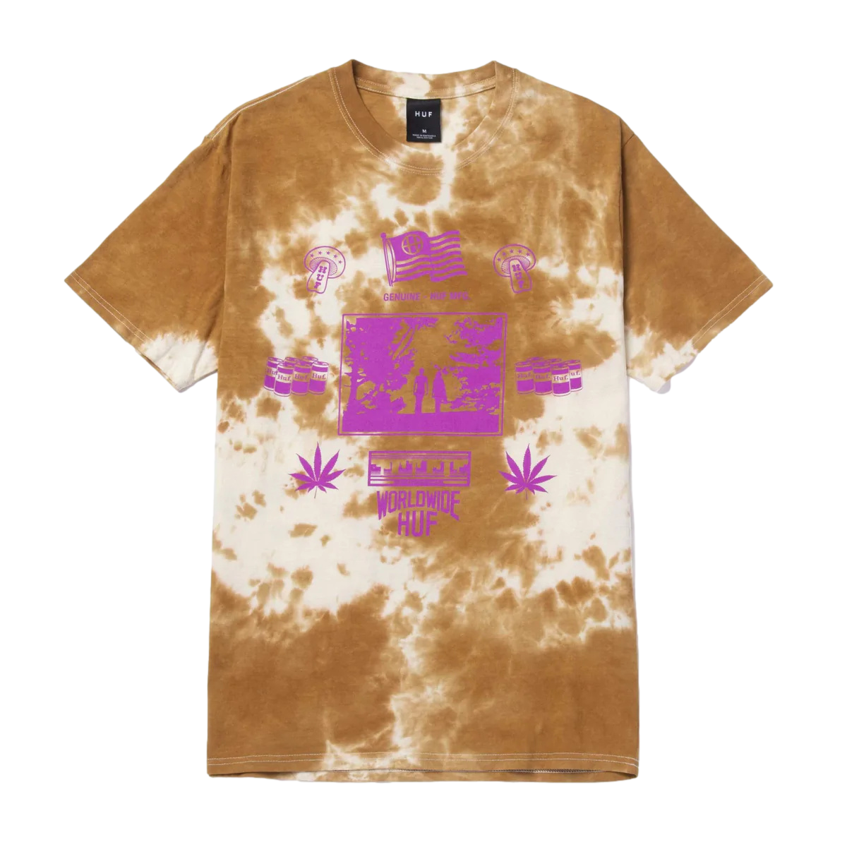 HUF Gathering Men's Tie Dye Tee. The Gathering Short Sleeve Tee is made of pure cotton dipped in a tie-dye wash and features a custom HUF graphic at the front dedicated to that kid who likes to "party at the moon tower."