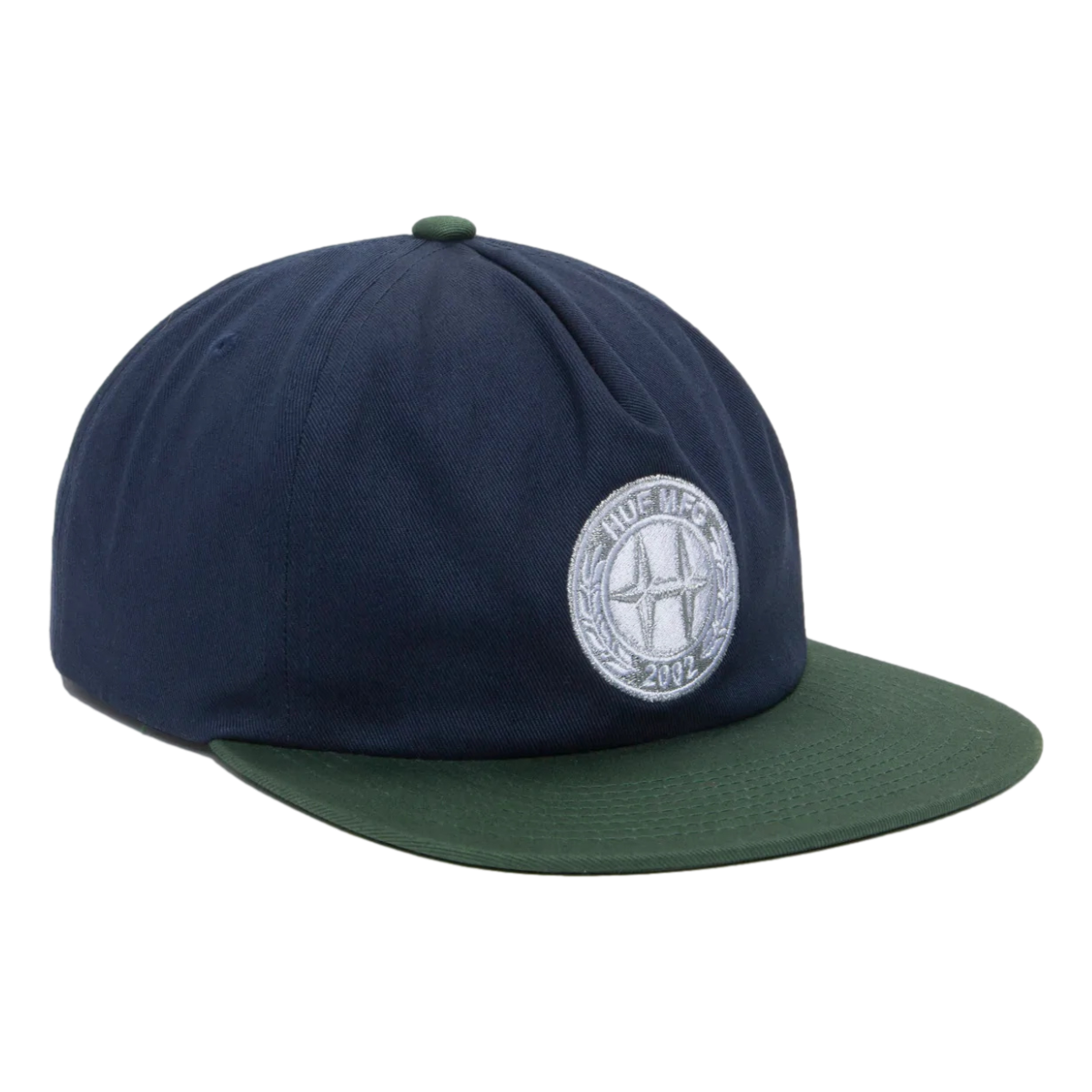 Huf H-Class Snapback Hat. 100% cotton twill 5-panel snapback hat. Inspired by vintage motorsports. Contrast visor. Metallic-thread direct embroidery artwork at front. Adjustable plastic snap closure. Embroidered eyelets for ventilation.