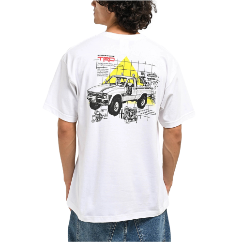 The official HUF x Toyota Racing Development Concept t-shirt arrives in a white colorway, featuring the schematics for the classic SR5 Hilux pickup from the 80s. With a co-branded logo graphic on the left chest, the collaborative t-shirt is finished off with a ribbed neckline and a printed collar tag.