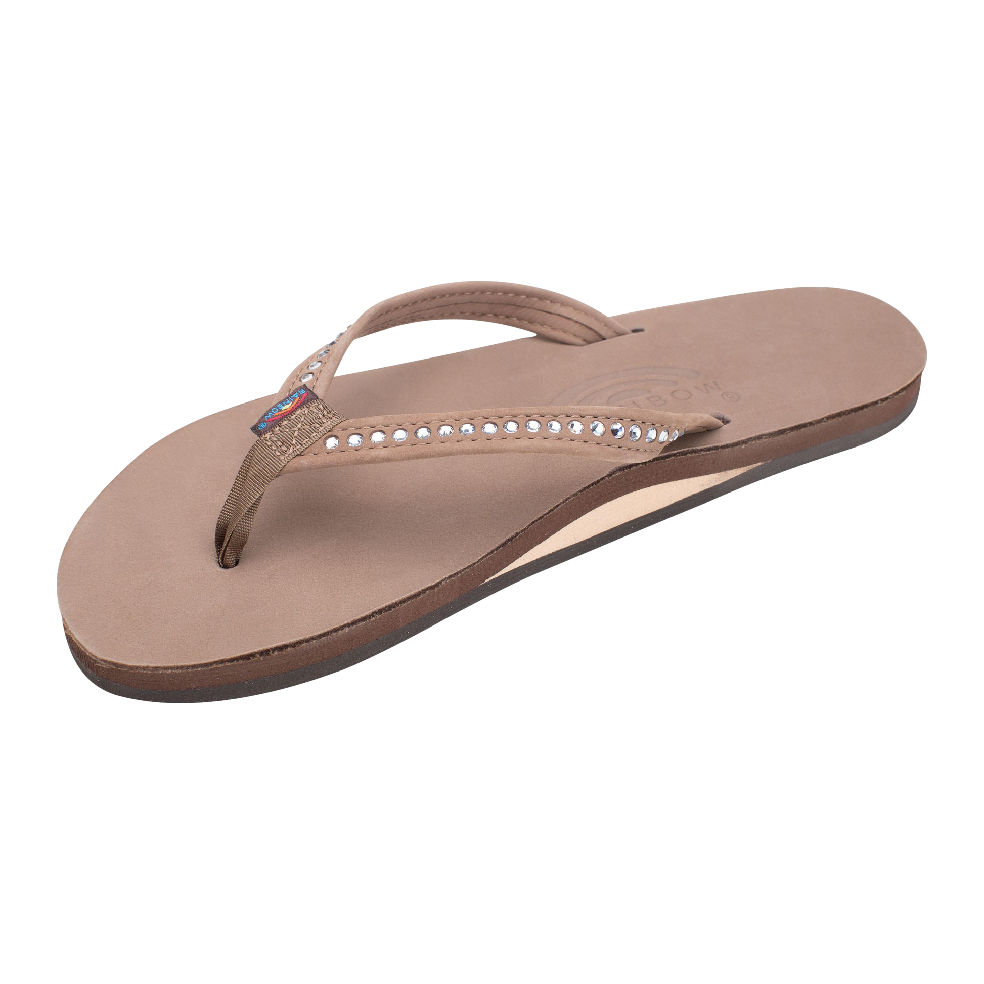 The Rainbow Single Layer Premier Leather with Arch Support is made of top grade nubuck leather; the top sole is embossed with the Rainbow® logo. This model comes with a 1/2" narrow strap, also nubuck leather; it is double stitched, and the nylon toe piece is secured with a box X stitch, all using bonded nylon thread.