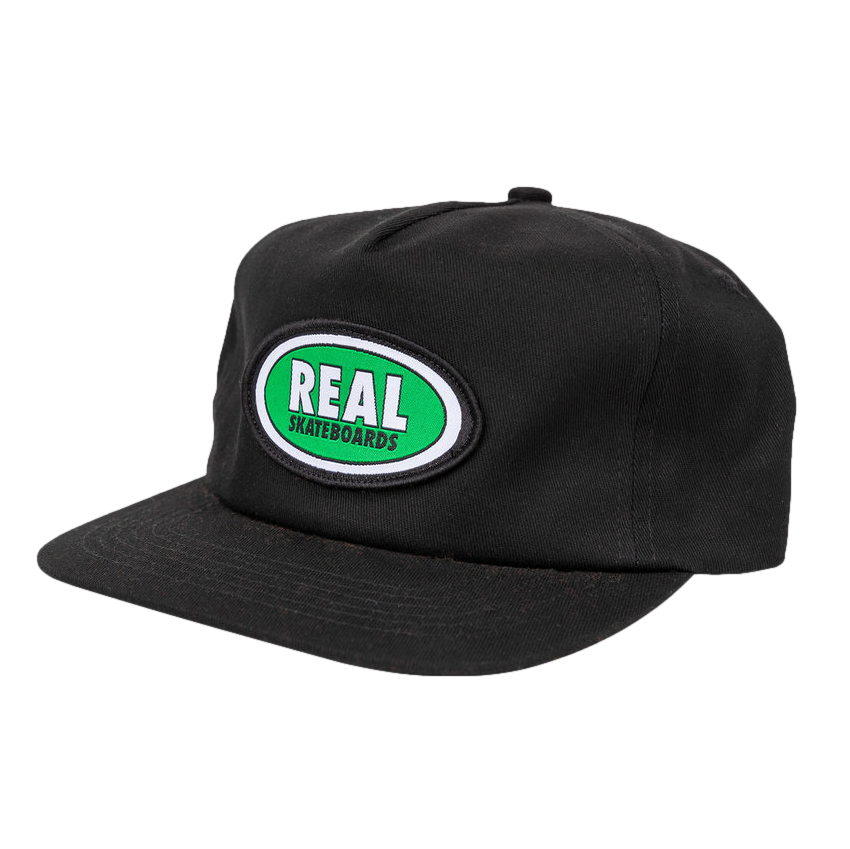 Real Oval Snapback Hat. 100% cotton snapback hat, featuring the Real oval logo on the front.