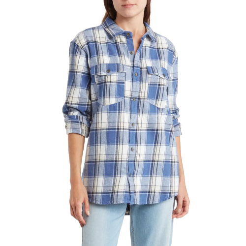 Roxy Let It Go Flannel. Allover pattern. Button front. Collar neck. Front patched pockets with flap closed by tortoise buttons. Button cuffed long sleeves. Rounded hem. Oversized fit. 100% Cotton. Machine wash. Imported.