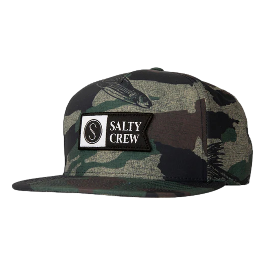 Salty Crew Alpha Tech 5 Panel Snapback Hat. 100% Polyester Structured, high-crown height Water resistant fabrication Woven damask patch Plastic snapback One Size.