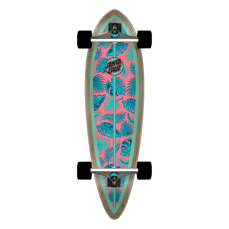 Santa Cruz Skateboards Cabana Dot Pintail Longboard Cruzer featuring updated, smaller pintail shape on 9 ply deck with Bullet 160mm reverse kingpin trucks and Santa Cruz branded 60mm 78a Slimeballs wheels.