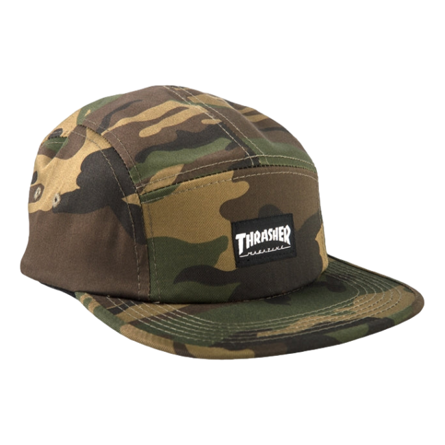 Thrasher 5 Panel Hat. This five-panel cap features a printed Thrasher label on the front, an adjustable buckle strap on the back and is constructed from heavyweight canvas for durability. One size fits most.