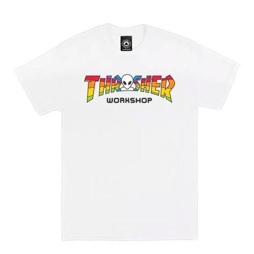 Thrasher x Alien Workshop come together to bring the Spectrum t-shirt in a crisp white colorway, showing off collaborative script across the chest combining the two companies names to read "Thrasher Workshop" adding pops of color in every accent the rainbow has to offer. This everyday tee is made from a midweight cotton, offering a clean look with a regular fit and a ribbed crewneck collar.